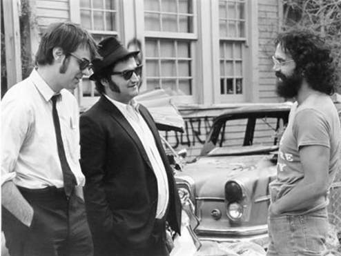 Dan Akroyd and John Belushi meet Tommy Chong on the Blues Brothers movie set. [Found here.]