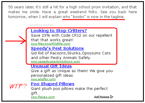 Yep. The algorithm that generates ads decided to eliminate raccoons and sell poop-shaped pillows. Made me smile, and that brings us back to boobs.