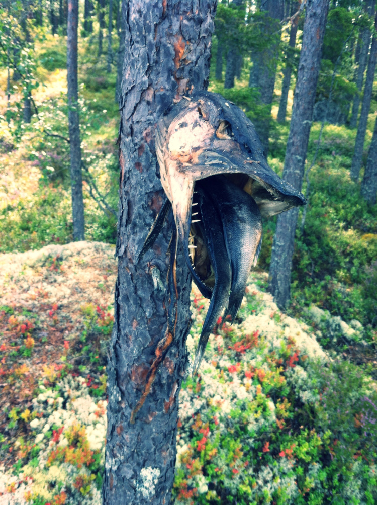 “I’ve found a three. On the three it hang a head. A head of a fairly large fish. In the fish heads mouth it were two other, smaller dead fishes.”