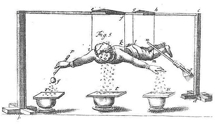 The depiction above shows one of Gray’s most famous experiments, in which he showed that a boy suspended by (insulating) silk cords could be charged (with the glass tube) and then as a (conducting) body could (electrostatically) attract small objects. Dramatic experiments such as these became quite well-known. Finally, after Newton’s death in 1732, Gray was admitted as a member of the Royal Society in recognition of his efforts, but he died destitute a few years later in 1736. [via]