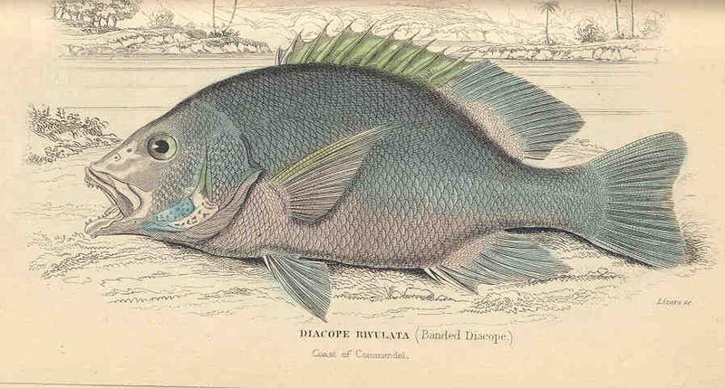 [Top image of a Banded Diacope, (Jardine, William (1843) Fishes of the Perch Family, Naturalist’s Library, vol. XXXVIII, Edinburgh, Scotland: W. H. Lizars) found here.]