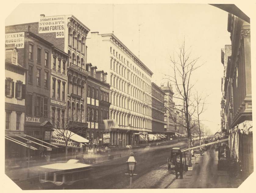 Broadway looking north from between Grand and Broome Streets in New York City, 1853–55.
