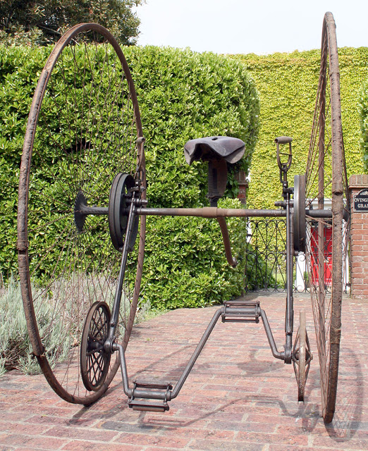 No idea how this works, how to steer, how to brake, but it was touted as a safety bicycle for people unable to handle a penny farthing. I’m guessing that if you came to a quick stop, you’d be either thrown face-first onto the pavement, or you’d rock back and forth until your lunch suddenly appeared on your lap. Once you started pedaling, the same rocking thing would happen again with the same result, only messier.