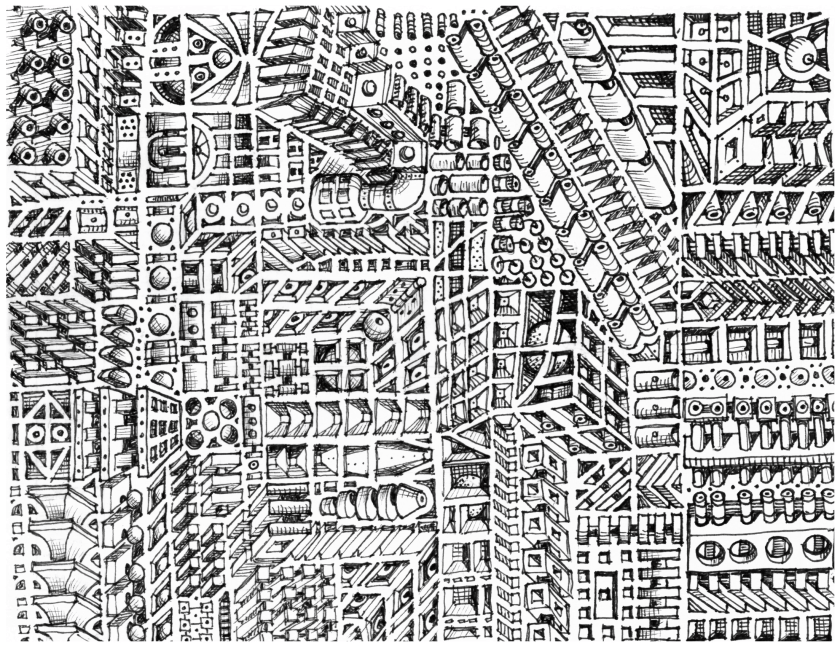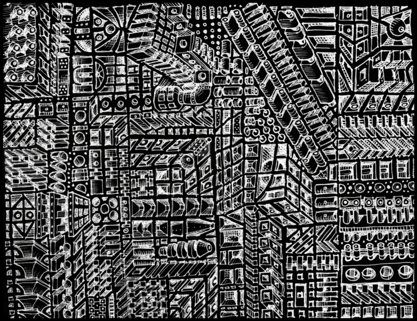 Out of curiosity, I inverted the black & white, and the image spooked me – there are things crawling around in there that I didn’t see while doodling (like the giant robopillar rising up from the cityscape below).