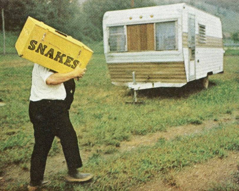 Sideshow manager carries snakes from a small tent to his trailer.