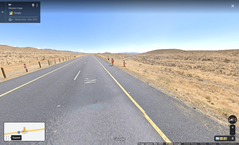 A Google street view of the main highway between Johannesburg and Cape Town. LOL one lane each direction. The weed whacking crew are trimming excess vegetation!