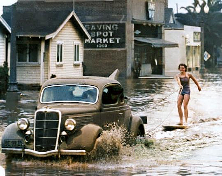 “Surfer Mary Ann Hawkins. The photo was taken by famous surf photographer Doc Ball in Long Beach. The date usually given for the photo is 1938 and there was a flood in Los Angeles area in 1938; however, the license plate on that 1935 Ford looks like a 1936 California plate.”