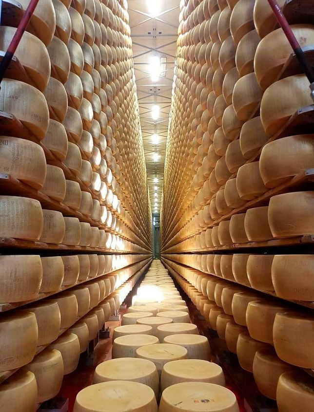 Housed in a high-security complex surrounded by barbed wire, the bank, known locally as Credem, holds some 430,000 wheels of Parmigiano-Reggiano made by farmers in the area. The stacks sit 20 wheels high and are carefully monitored. Credem staffers regularly clean, rotate, prick, and even taste each wheel.
