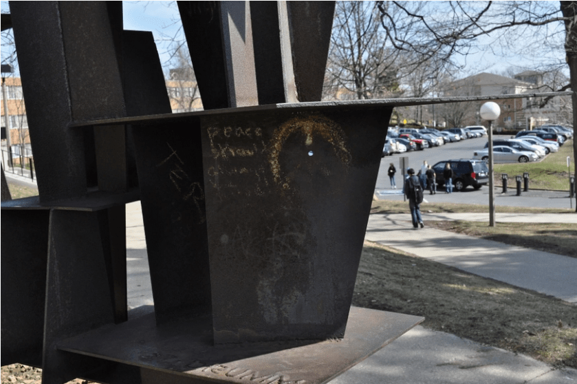 Top: Steel plate sculpture in front of Taylor Hall, purported bullet hole visible.