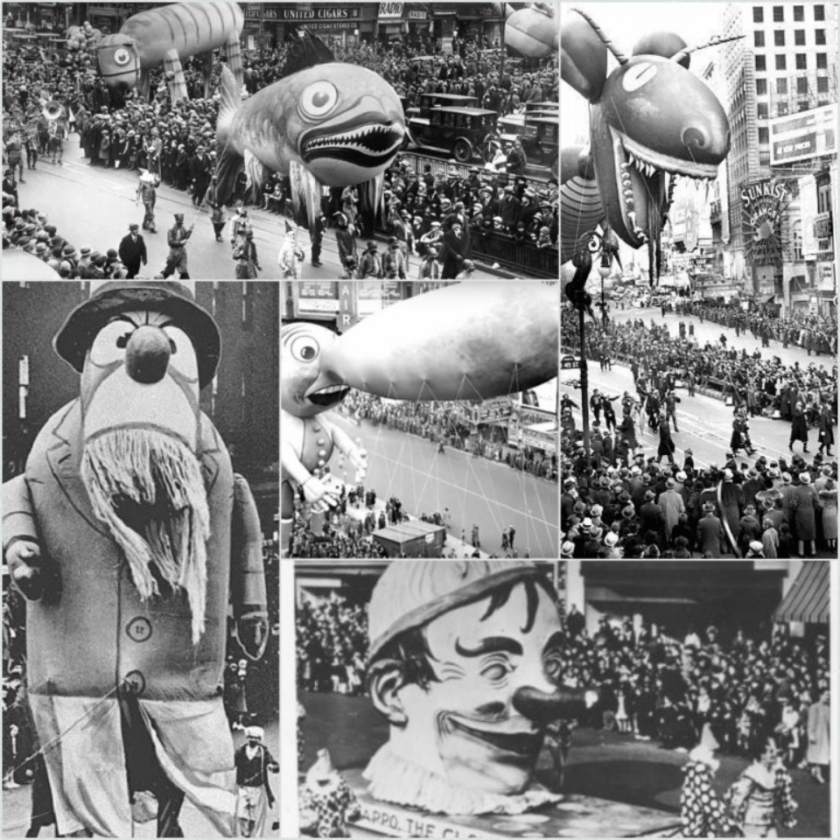 The early Thanksgiving Day parades often had a circus orientation, and hence the animal elements. Actual lions, tigers, and bears were trucked down city streets, traumatizing them and causing the elicitation of roars and growls that frightened observing children. Wisely, the use of living animals was abandoned after a few years, with animal balloons and floats substituted, together with some great vintage cartoonish stuff that was rather surreal.