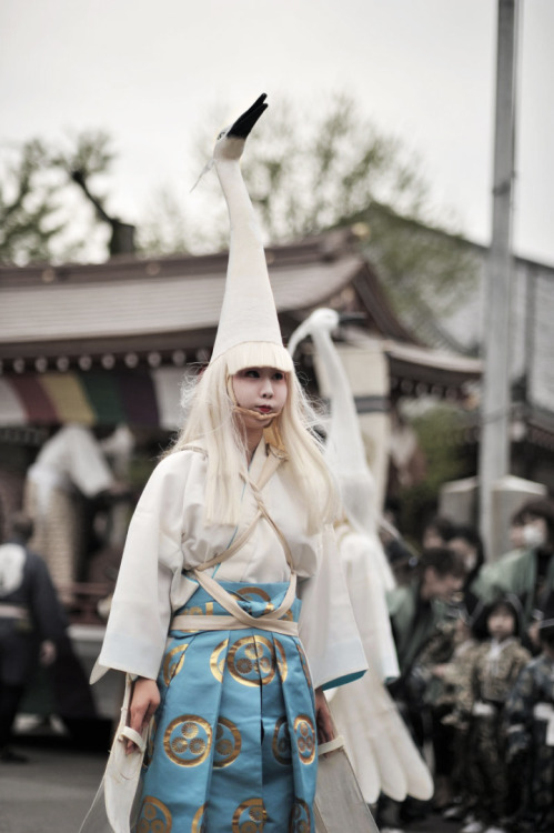 Twice a year at Asakusa’s famous Sensoji temple an old ceremony of dancers dressed as white egrets or herons take place, once in April and once in November. The ceremony is called Shirasaginomai (白鷺の舞) and was revived in 1968 using an old scroll as a basis that had been found in the temple, depicting a ceremonial dance in 1652.]