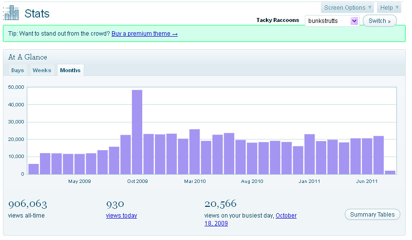 Just took a peek at the stats and noticed that we’ve surpassed 700,000 hits since Tacky Raccoons done been borned! Thanks to everyone for stopping by.