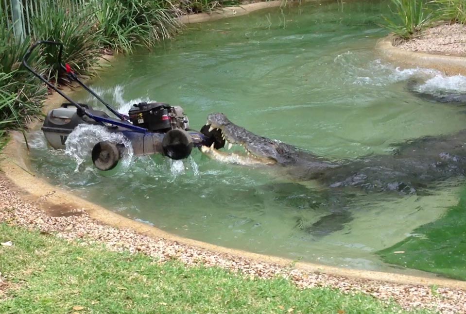 Elvis the crocodile attacks a lawnmower at the Australian Reptile Park in Gosford, north of Sydney, in this still image taken from video December 28, 2011. Two workers at a reptile park near Sydney ran for their lives on Wednesday when a 500 kg crocodile named Elvis suddenly lunged at them, making off with their lawnmower.