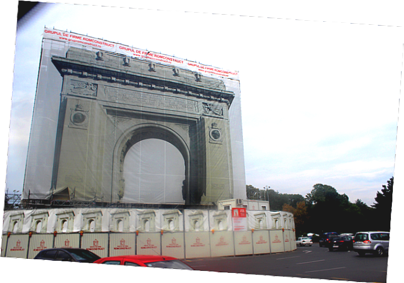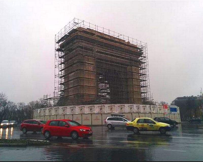 That’s the Arcul de Triumf, a monument dedicated to the veterans of Romania’s War of Independence against the oppression of the Ottoman Empire (and later for Romania’s role in WWI). This is its 3rd incarnation: the 1st was wooden, erected in 1878. It was replaced with another in 1922, then that one was demolished and rebuilt in 1936. So what’s behind the curtain? This: