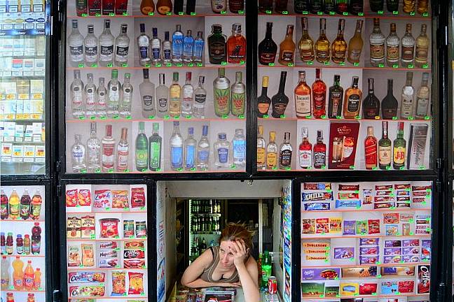 In the late 80’s, private ownership of production was legalized in Bulgaria. Among the first businesses to appear were these small “Squat Shops,” operated out of floor-level cellar windows. Despite more legitimate storefront space becoming available, these small portals remained operational and lucrative – miniature convenience stores catering to the cigarette fix of the passing pedestrian or the midday thirst of those waiting on bus stops, for which patrons have no objection to stooping to street level. An idiosyncratic, now common element of the Bulgarian capital, over time the shops have evolved elaborate displays, framing the small street level openings with bottles of alcohol, coffee, and cartons of cigarettes, often in eye-catching bright colors. –Ivaylo Getov.