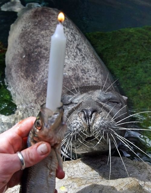 Smoke, a 39 year old harbor seal in captivity at the New England Aquarium is presented with a special present for her birthday in Boston, MA. Like many people of such advanced age, the seal has very limited vision. Life expectancy for most seals is the mid-20’s.