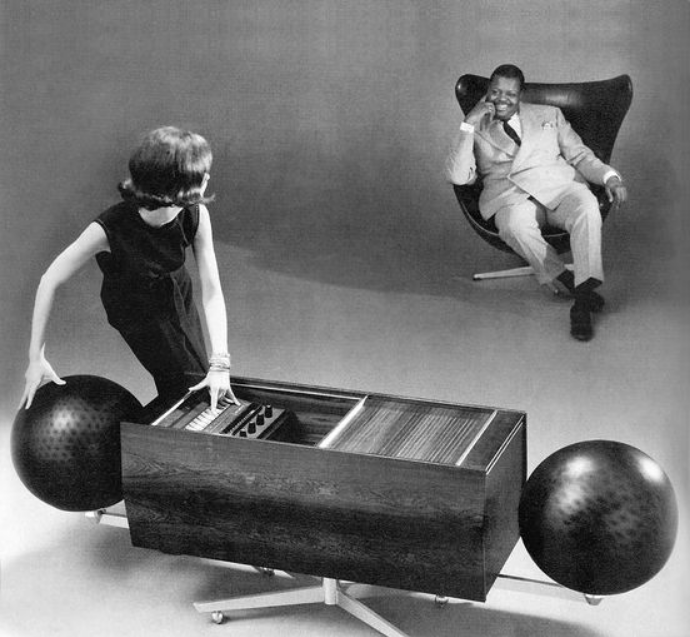 The Project G stereo, produced by Canadian company Clairtone from 1964 to 1967, was a design marvel with its rosewood cabinet and rotating “sound globe” speakers. Famous owners like Hugh Hefner and Frank Sinatra showcased it as a symbol of sophistication. Despite its $2,000 price tag (around $20,000 today) limiting its market, fewer than 400 units were sold. The Project G has since become a collectible icon, epitomizing the sleek 1960s Jet Age style. Pictured here is Jazz pianist Oscar Peterson and an unknown model. Photographer unknown, circa 1964.