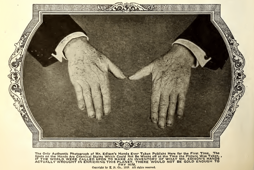 The Only Authentic Photograph of Mr. Edison’s Hands Ever Taken Publisht Here for the First Time. The Spots on the Hands Are Chemical Stains Which Could Not Be Washt off at the Time the Picture Was Taken.