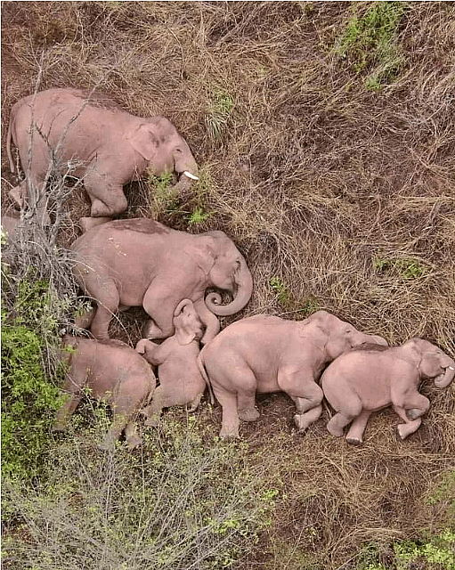 Drone photographs taken on Monday by the provincial forest fire brigade showed members of the herd sleeping in a clearing in the middle of a forest in the district of Jinning, which has been hit by heavy rain and thunderstorms.