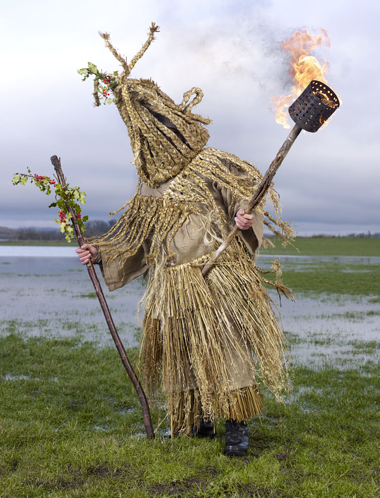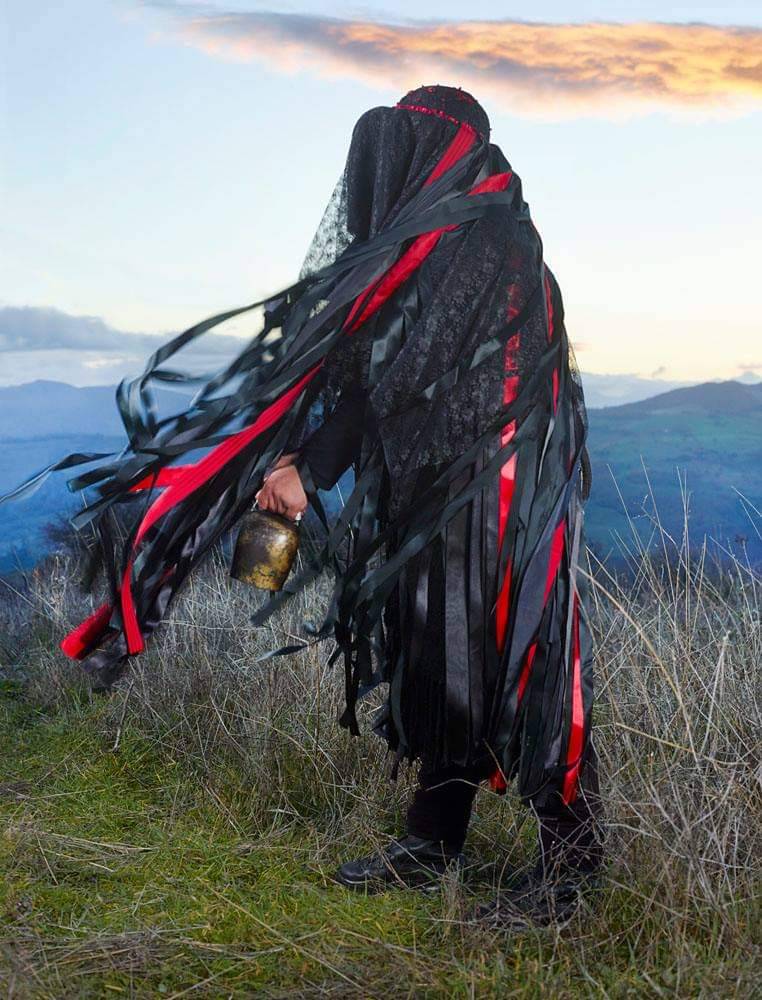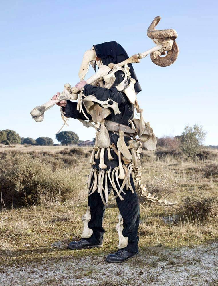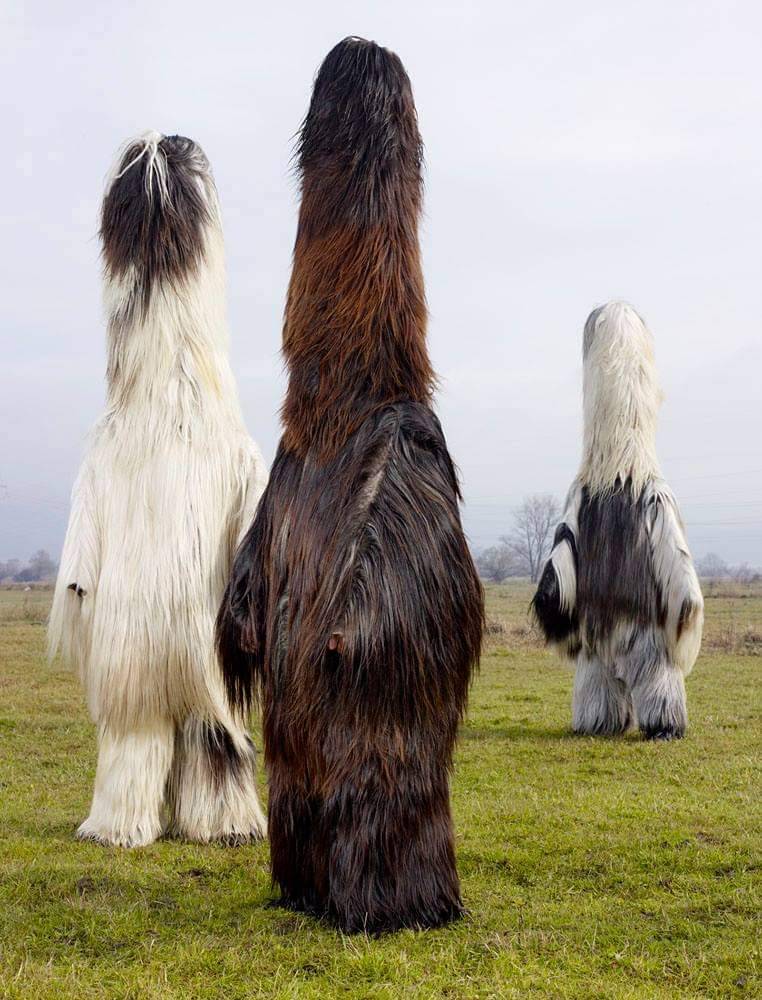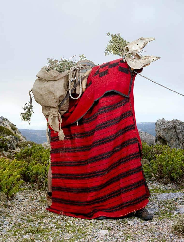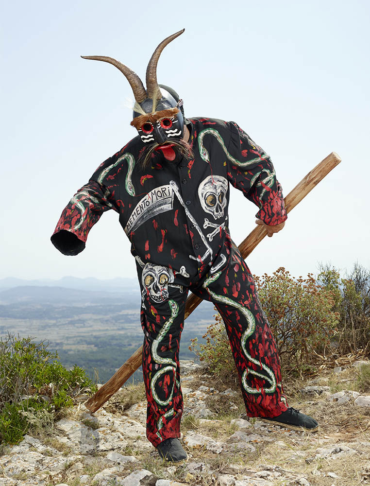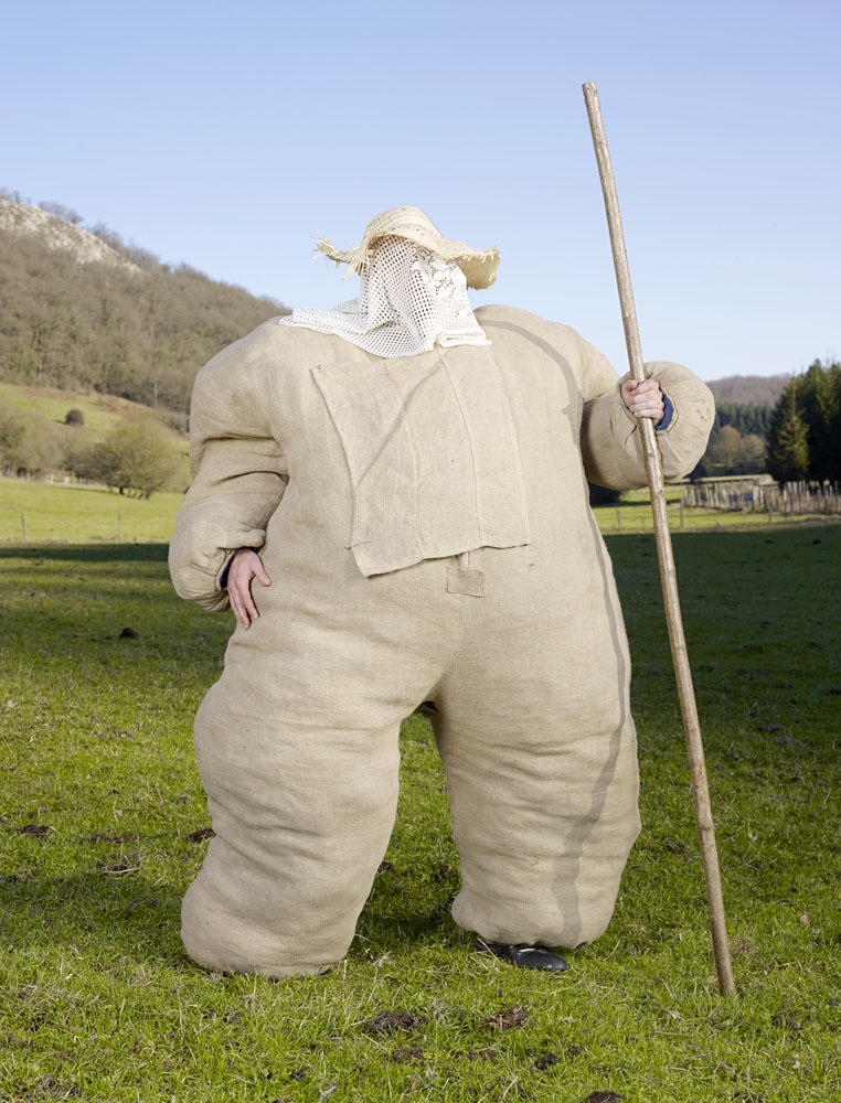 “In 2010 the French photographer began traveling to rural farming villages in over a dozen European countries to document people, pictured mostly alone, out in the wilderness, wearing homemade costumes used in celebratory events marking the solstices, the harvest and coming of winter—calendar dates that, after millennia and the ‘civilizing’ of Pagan populations, eventually mutated into Christmas and Easter. The costumes referencing human/animal hybrids are cobbled-together, yet visually astounding.”