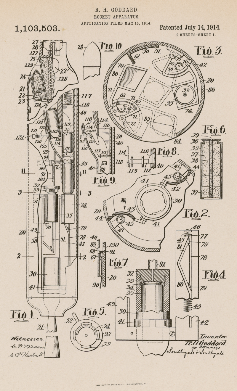 Robert Goddard’s 1914 Patent for a liquid-fueled rocket. Consider that in 1914 we barely knew how to design airplanes. In those days, the fuel gauge was a pocket watch hung on a nail.