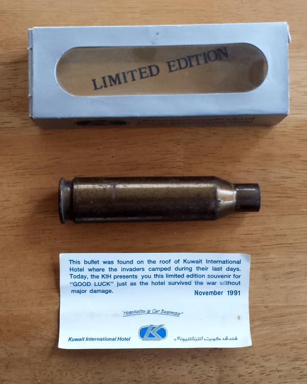 Above: Kuwait International Hotel after occupation by Iraqi forces in 1991. Much of the interior was burned out as these pictures show. More on cartridge casings here.