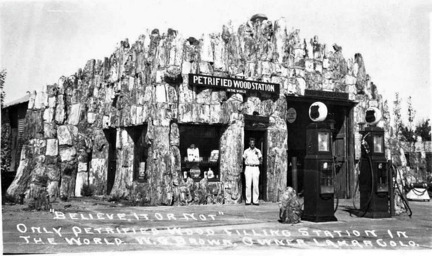 [Top image: Petrified Wood Gas Station is now a used car lot.]