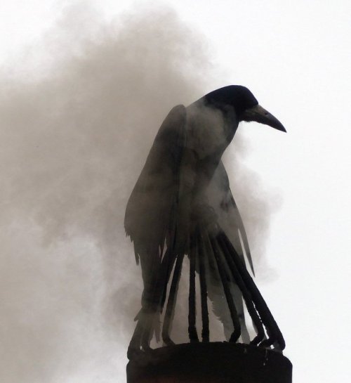 “The Rook is sat on a smoking chimney pot, its wings outstretched, seemingly unbothered by the heat and possible effects of smoke inhalation. Such behaviour seems completely bizarre, yet there is a reason for it: the bird is using the smoke to clear parasites, such as mites and ticks, from its plumage.”
