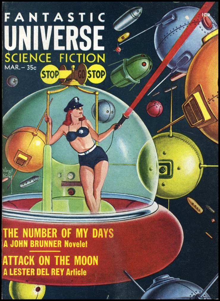 [March 1959 issue of Fantastic Universe Science Fiction magazine. FUSF was published from 1953 through 1960. More space bimbos here.]