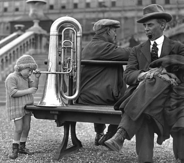 Czech midget showman Baron Richard Nowak, 19, stands 19 inches high & weighs 17 lbs., while posing on pedestal on the midway at the Hamid-Morton Circus next to one of the band’s tuba players. Location: Trenton, NJ, US. Date taken: July 1940. Photographer: John Phillips.