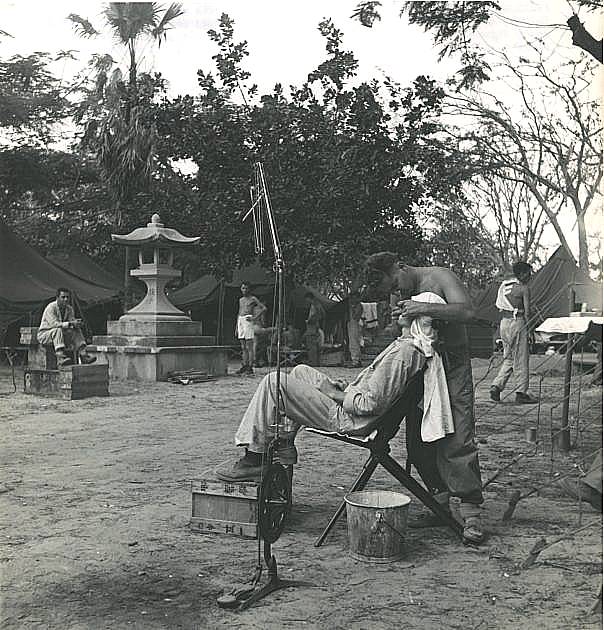 “A Marine dentist sets up his office on Saipan, using a Japanese box as a footrest, a Japanese pail as a waste-bucket, and a Japanese shrine (left background) as decor for his waiting room. In order to keep his dentistry really ‘painless’ a Marine patrol nearby kept on the alert for Jap snipers.” (U.S. Naval Institute Photo Archives)