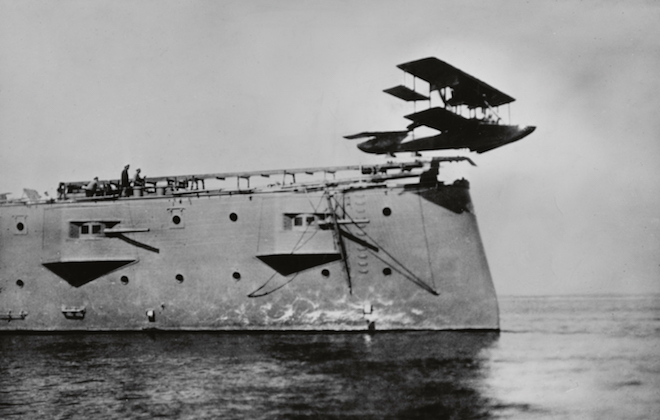 [The] catapult was installed on board the U.S.S. North Carolina during the late summer of 1915. The first test was made with a plane which carried no pilot, with the controls lashed in flying position. The experiment was successful so far as the catapult was concerned, although the plane stalled at the end of the track and spun into the water. This was sufficient proof for Lieutenant Commander Mustin, commandant of the station, and he ordered the second plane aboard to be prepared for a catapult shot. Climbing in and warming up the engine he flew the first plane off a catapult mounted on a ship. After several live shots, the next attempt was to catapult a plane while the ship was definitely under way. Lieutenant A. A. Cunningham, U.S. Marine Corps, was selected for this experiment. This shot, however, failed and the plane struck the water with one wing and turned over. Fortunately, the pilot swam out from under and was picked up by a boat.